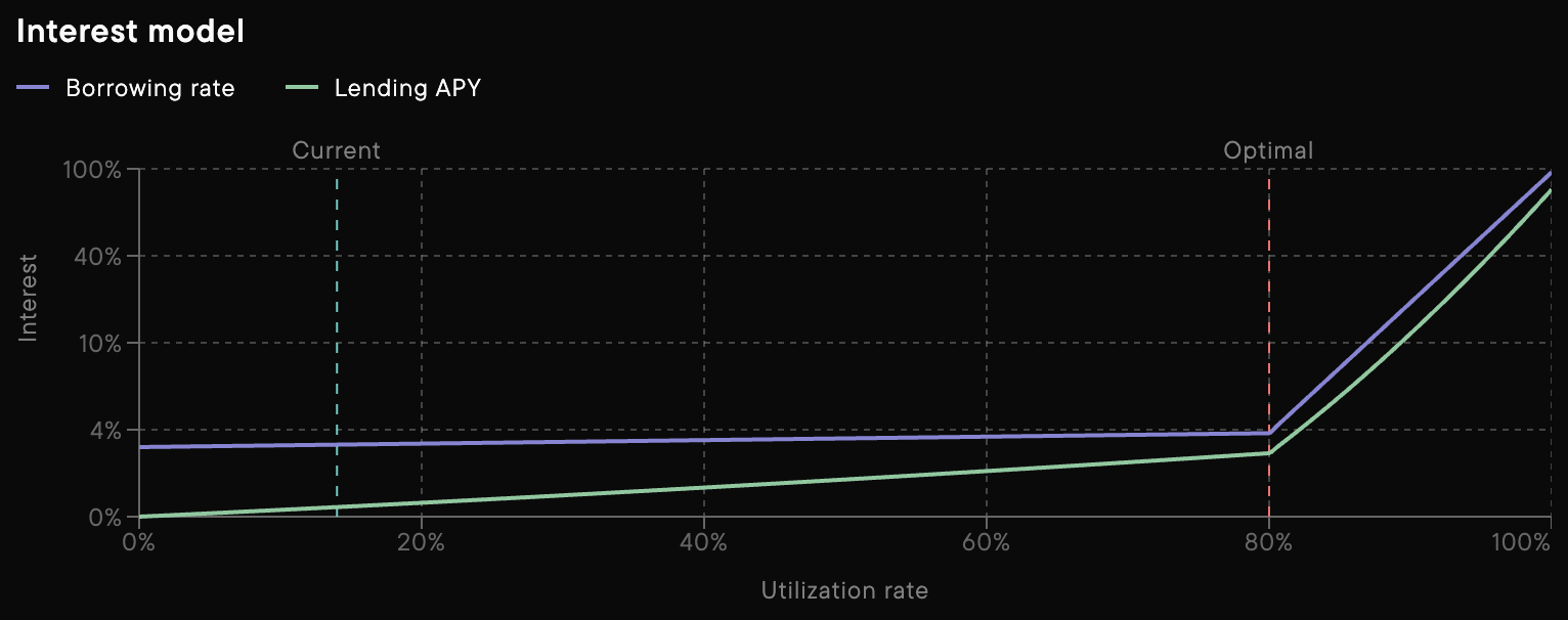 Interest rates in each pool dynamically adjust based on supply and demand to maintain economically optimal conditions and secure the protocol. When utilization is low, rates are kept low to encourage borrowing. As more funds are borrowed and liquidity becomes scarce, rates increase to incentivize repayments and new supply. This creates a self-balancing system that ensures pools always have adequate liquidity for withdrawals while maximizing capital efficiency.